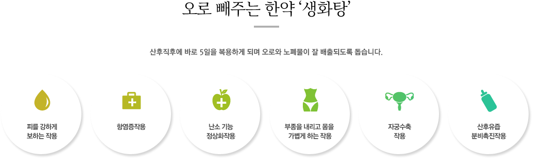 산후에 복용하는 한약으로는 오로ㆍ노폐물 배출을 원활하게 해주는 '생화탕'과 산후회복을 도와주는 조리한약인 '안궁탕'이 있습니다.
